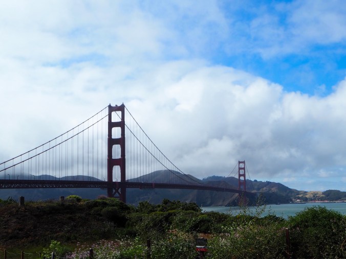 I hopped off the cable car at Lombard Street, and after winding down the crookedest street in the world with a horde of fellow tourists, I walked over to Fisherman’s Wharf. It was gray and chilly, but I’m always excited to see water, whatever the circumstances. I was also excited to stumble across an In-N-Out Burger. I’ve always heard how amazing their burgers are, and they’re not found on the East Coast, so I waited in an obscenely long line for one of their famous cheeseburgers. Honestly, I didn’t think it was as amazing as advertized, but I was happy to have tried it. And I was also happy to have food at all since I hadn’t eaten anything since breakfast the day before. After a couple more stops I made my way toward the Golden Gate Bridge.